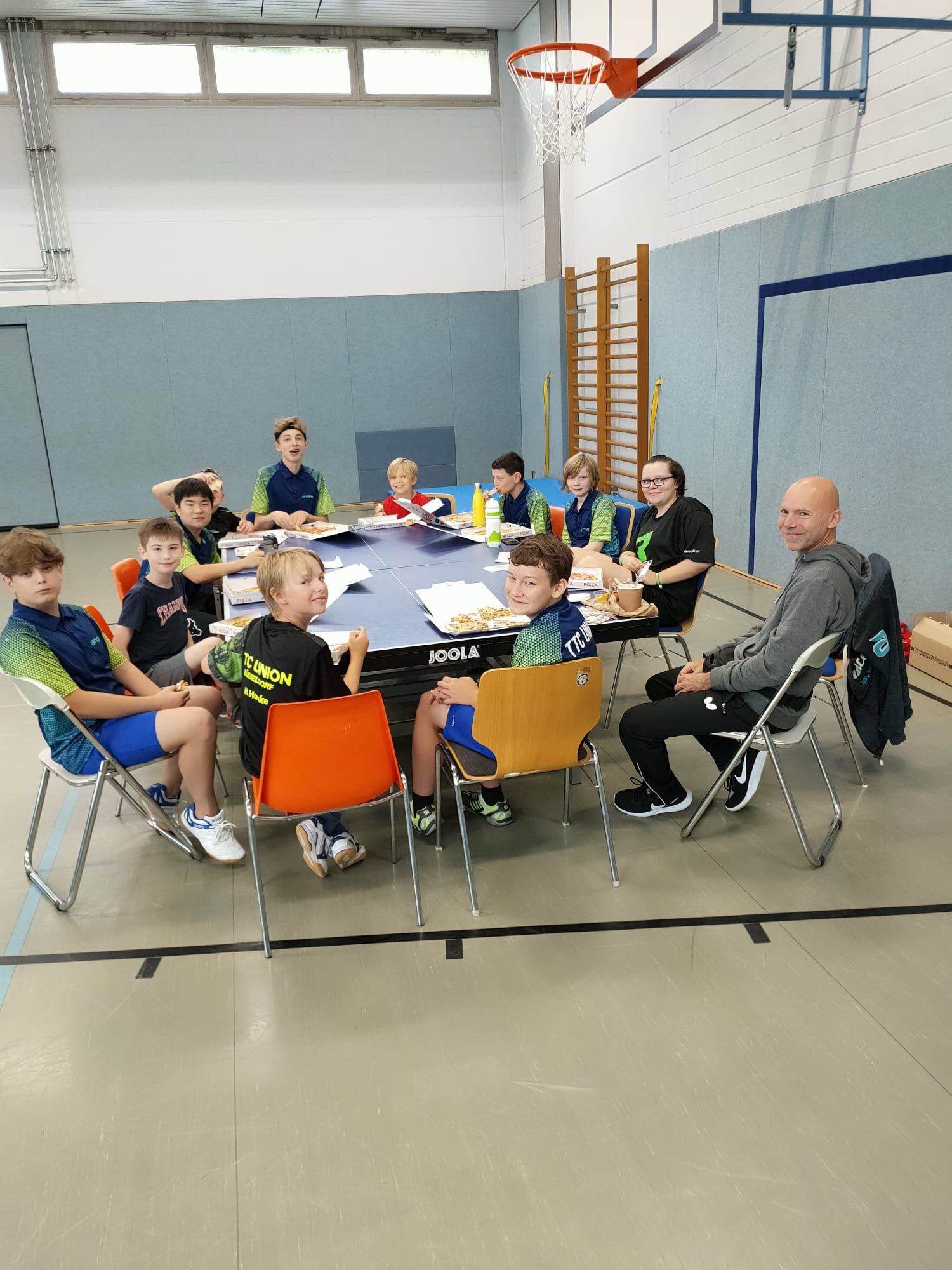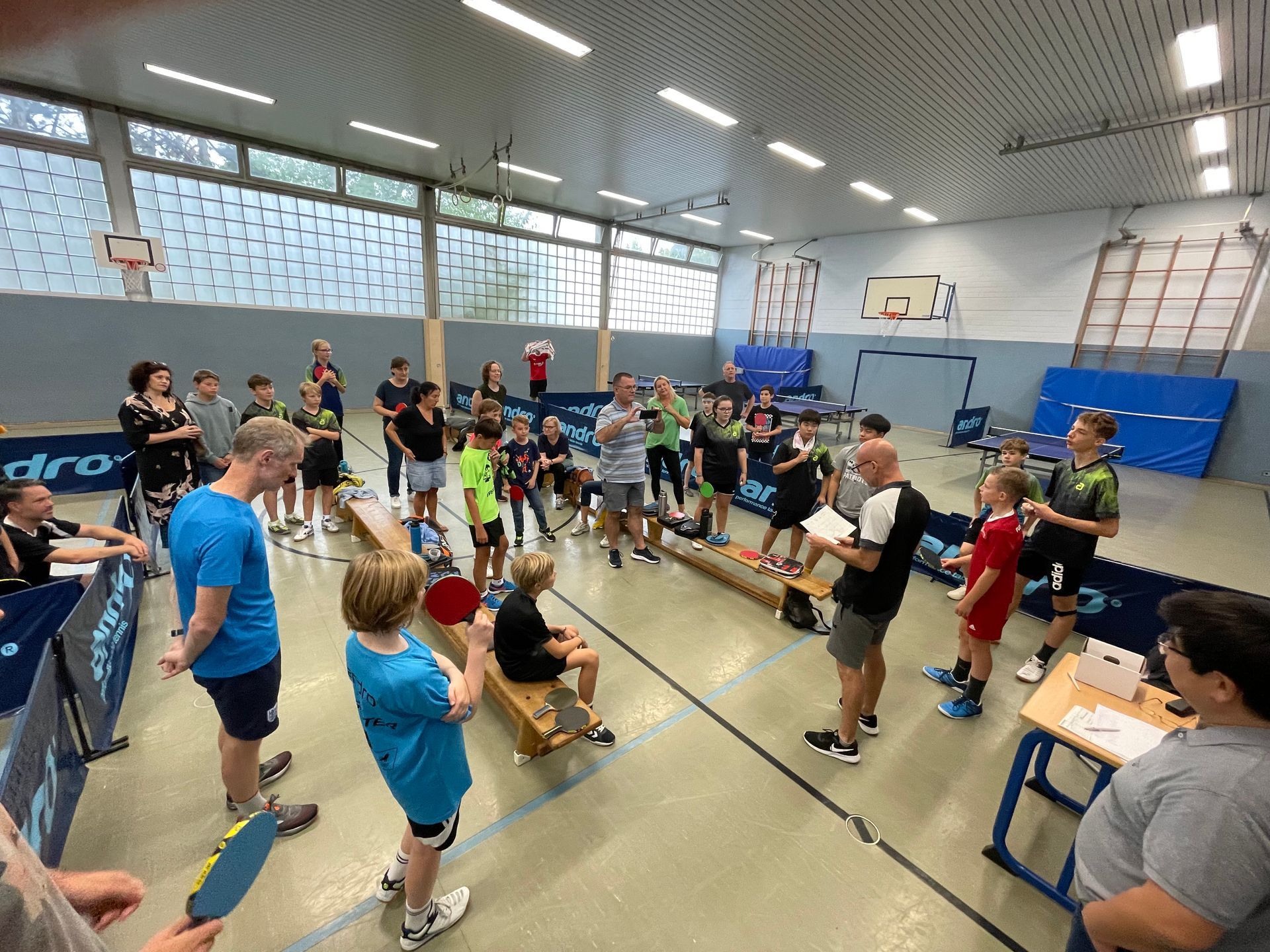 Das Wetter hatte es nicht gut gemeint mit unserem Sommerfest. Dennoch haben wir uns die Laune nicht vermiesen lassen und haben im Schutz des Schulhofs unsere kleines Buffet aufgebaut. Und dann ging es auch schon los: das Eltern/Kind Turnier. Ein bunt gemischtes 18er Feld ging in vier Gruppen aufgeteilt an den Start. Der Modus: zwei Gewinnsätze, erst das Eltern-Einzel, dann das Kinder-Einzel und zu guter Letzt das Doppel der Mannschaften. Die Ergebnisse wurden von unserem ersten Vorsitzenden Winfried genau notiert. Zum Schluß trafen dann die besten Mannschaften der jeweiligen Gruppe in einem K.O. Turnier aufeinander. Dort setzten sich Miro mit seinem Vater Roland durch. Gratulation zum Sieg, gewonnen haben aber alle!